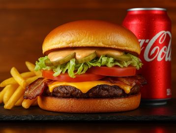 Um suculento hambúrguer artesanal de 150g, feito com carne bovina selecionada e grelhada no ponto certo. Coberto com duas fatias de queijo cheddar Schreiber, bacon crocante, tomate fresco, alface americana, picles especiais e nosso molho artesanal secreto. Tudo isso no pão brioche macio e dourado. Se você ama bacon, esse é o seu burger!