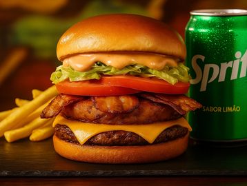 Prepare-se para uma experiência única! Um poderoso blend de carnes, com um suculento hambúrguer artesanal de 150g e um irresistível hambúrguer de frango empanado, combinados para criar um sabor único. Tudo isso coberto com duas fatias de queijo cheddar Schreiber derretido, bacon crocante, tomate fresco, alface americana, picles especiais e nosso molho artesanal secreto. Servido no pão brioche macio e dourado.