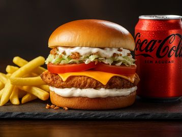 Dois suculentos filés de frango empanados artesanalmente, dourados e crocantes, cobertos com queijo cheddar Schreiber. A combinação perfeita com alface americana fresca, tomate e cebola crispy, trazendo crocância extra. Finalizado com nossa irresistível maionese defumada e servido no pão brioche macio e dourado. Uma missão de sabor impossível de resistir!