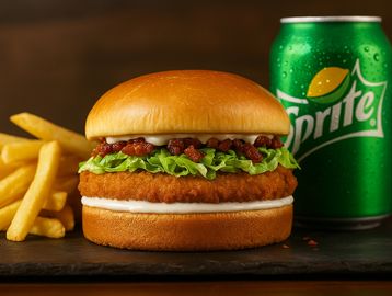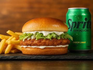 Um irresistível hambúrguer artesanal 100% peito de frango empanado, dourado e crocante por fora, suculento por dentro. Combinado com bacon picadinho e defumado, alface americana fresca e nossa maionese artesanal especial cremosa, tudo isso no pão brioche macio e dourado. Uma explosão de sabor em cada mordida!